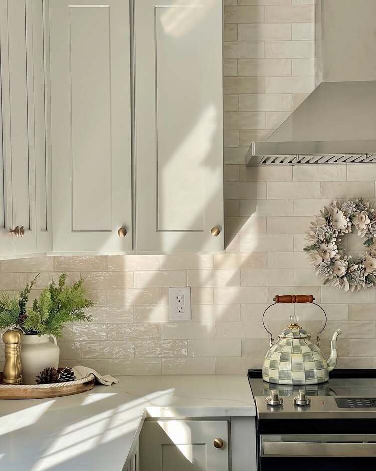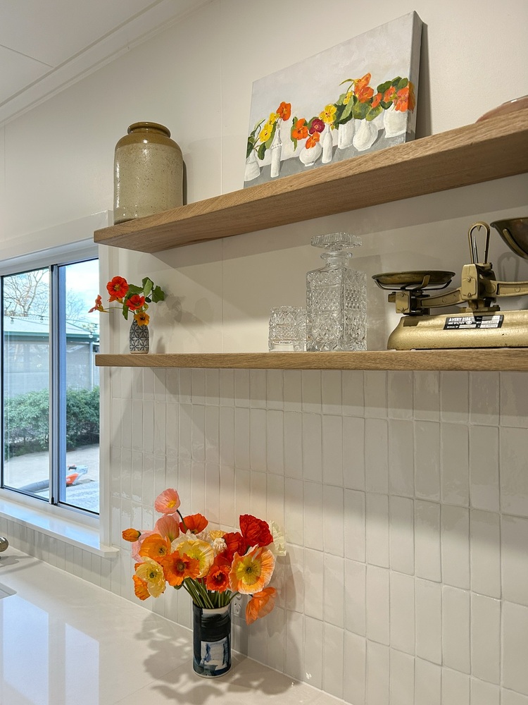 Simple, bright, and honestly so photogenic. The secret is the satin oak shelf and a few clear glass pieces to throw sparkle. For a clean kitchen backsplash tile look, choose rectified edges if you want tight joints. Or go handmade-edge if you like a wavy shadow line. Both are solid backsplash tile options.