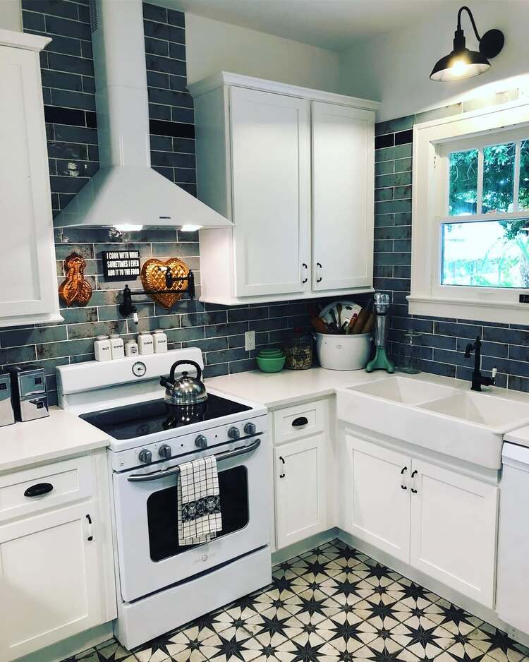 Moody blue bricks laid in a running bond are classic and cool. Notice the matte finish. It hides splashes from spaghetti night. For this tile backsplash style, pair with black sconces and simple shaker doors. I’d keep counters light and quiet. And yes, it belongs in my 10+ backsplash tile favorites.