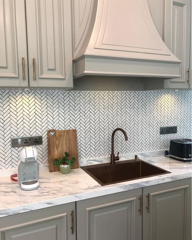 Tiny chevrons read crisp, almost tailored. A brushed-copper faucet warms it right up. Keep accessories minimal so the kitchen tile backsplash stays the star. If your cabinets are traditional, this pattern adds just enough modern without getting cold. Also yes, another entry on the 10+ backsplash tile list.