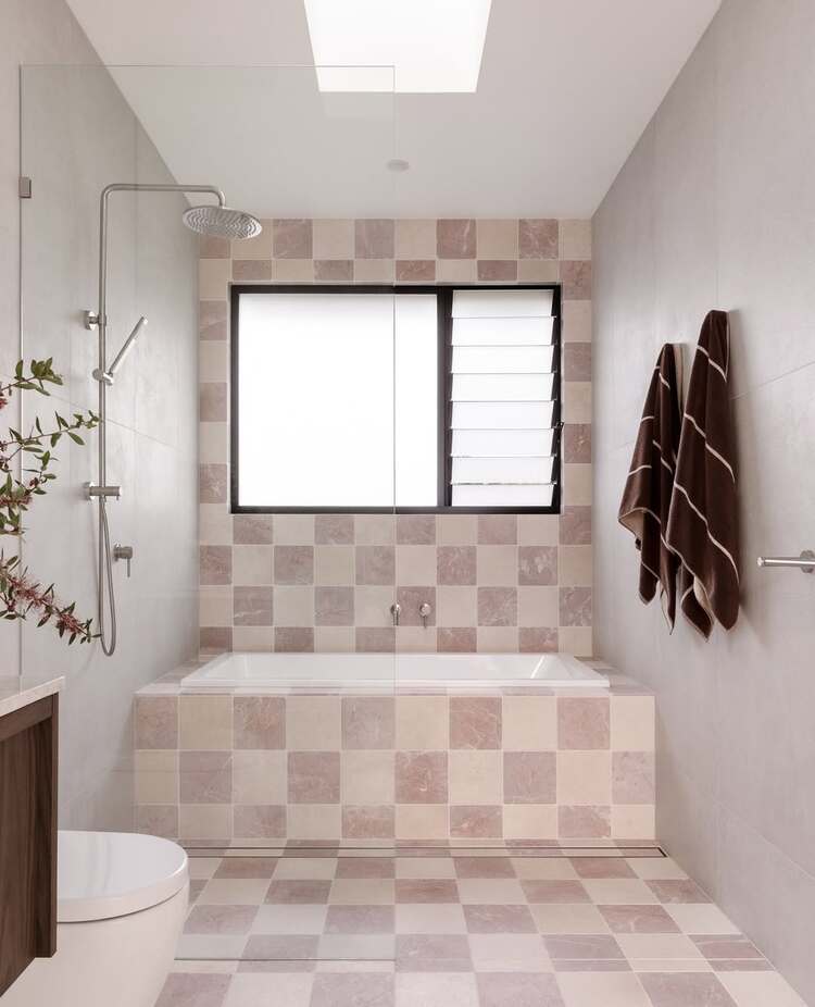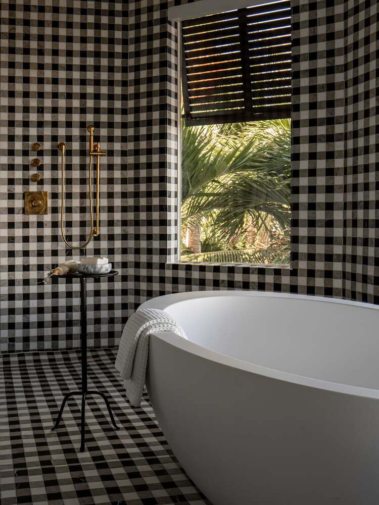 This full-room plaid is bold and cozy at the same time. The tub looks like a white boat floating on calm water. For tile ideas for tub surround like this, keep fixtures simple and warm. Brass sings here. If you want 10+ bath tile ideas tub surround impact without crazy cost, use porcelain checks with tight grout lines. Small confession, big checks hide water spots better than mini ones.