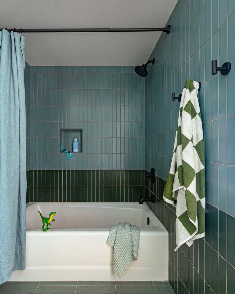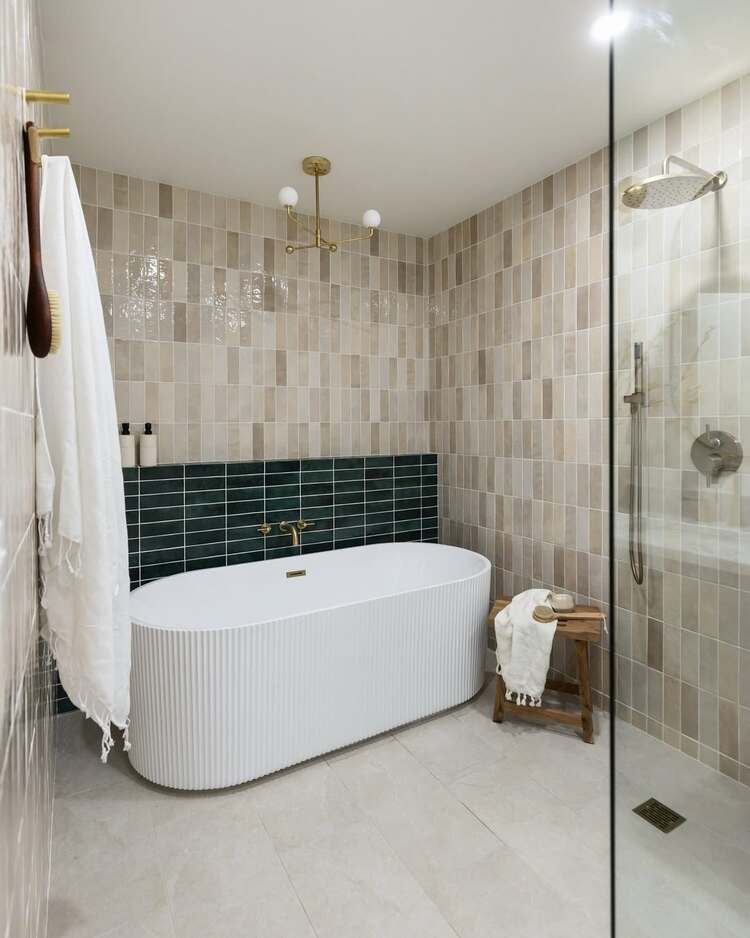 Soft glazed squares shimmer around the room while a ribbon of dark green behind the tub anchors it. This is one of those bathroom tile ideas for tub surround that photographs like a dream but feels warm in person. Use a 3 by 12 field cut to different lengths for that handmade look. Pro hack: bevel the niche edge with a metal trim so towels don’t snag.