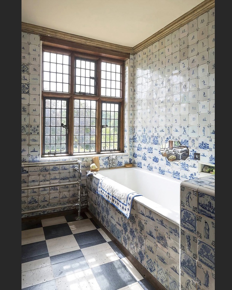 Tiny blue scenes on square tiles wrap the tub like wallpaper. The checkerboard floor keeps it grounded. For bathtub tile surround ideas with character, mix pattern on the walls and quiet on the surround edges. Choose a soft gray grout so it doesn’t fight the drawings. I’d add a plain white shower curtain to let the tile talk.