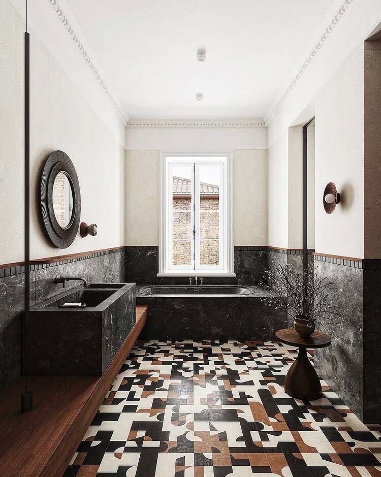 The patterned floor makes a statement and the tub surround stays in the dark stone lane. This is how bath tile tub surround ideas can be brave without chaos. Busy floor, calm surround. Keep the faucet line clean and matte. I learned the hard way that shiny chrome next to bold floors can feel jumpy.