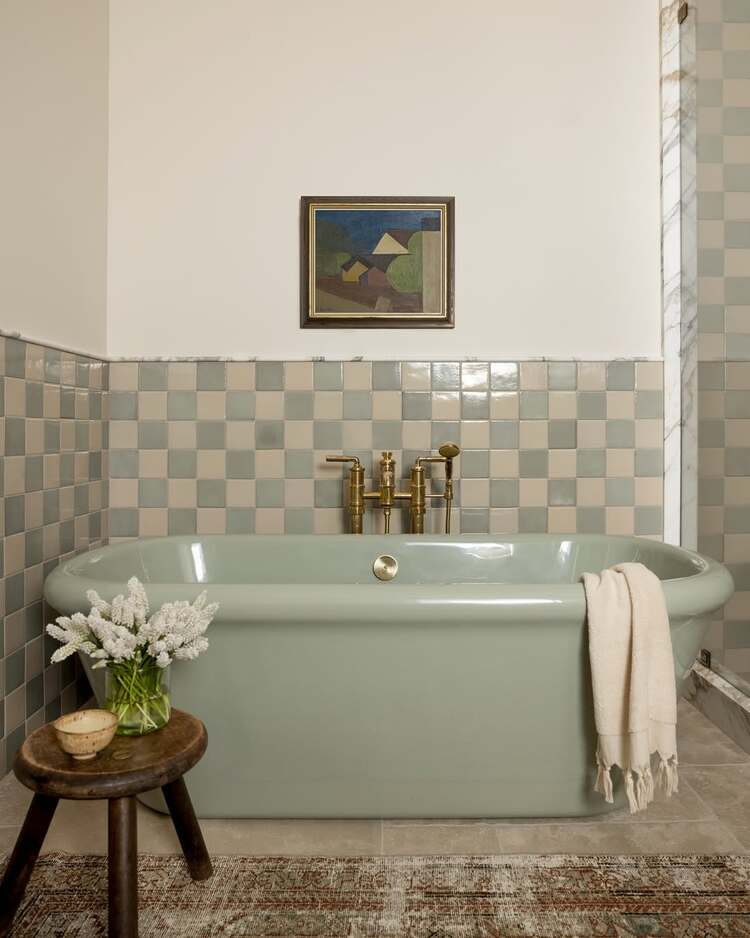 This room makes me smile like I found five bucks in an old coat. The checkboard tile climbs halfway, then drywall above keeps it breathable. If you want tile ideas for bathtub surround with charm, match the tub color to one of the checks. Add unlacquered brass so it ages right along with the tile. Throw in a worn rug and pretend you live in a country inn.