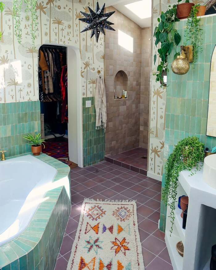 That curved, plaster-style vanity and the green tiles behind it are cozy and earthy. The clay-toned floor keeps everything grounded. Here’s my hack for floor and shower tiles that match but still feel relaxed. Choose one glossy surface and one matte. The mix helps light bounce while the room stays calm.