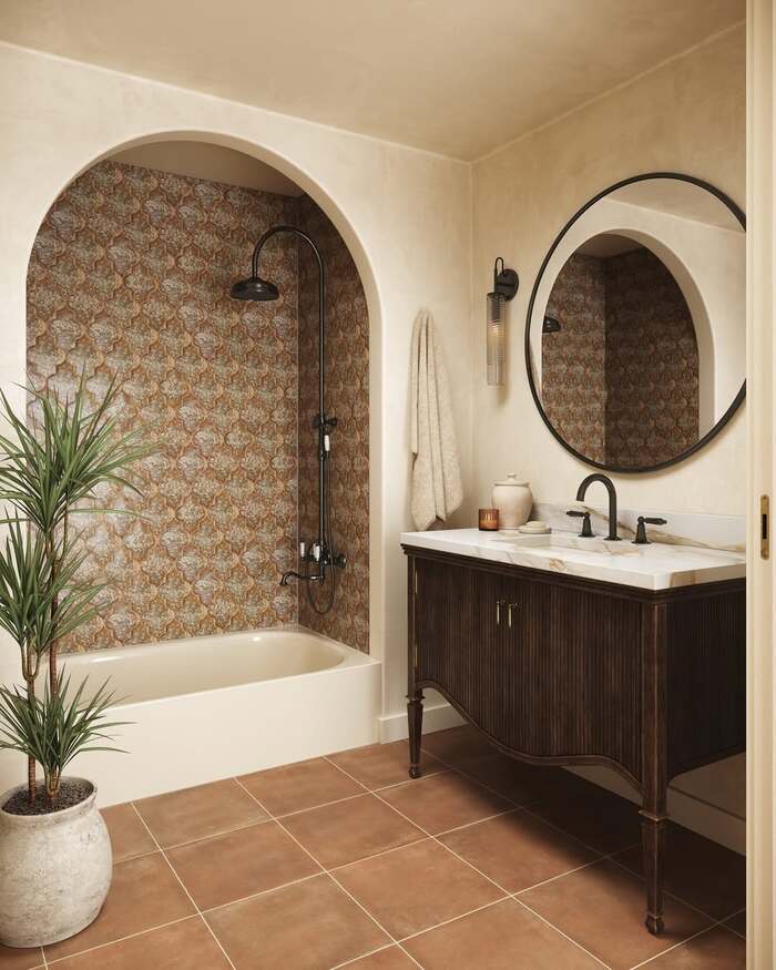 The arched alcove uses patterned tile in clay and cream while the floor repeats the clay tone in plainer squares. This is matching bathroom floor and shower tile done by echoing color, not pattern. I’d use a darker grout in the alcove and lighter grout on the floor, so cleaning is easier and lines stay crisp.