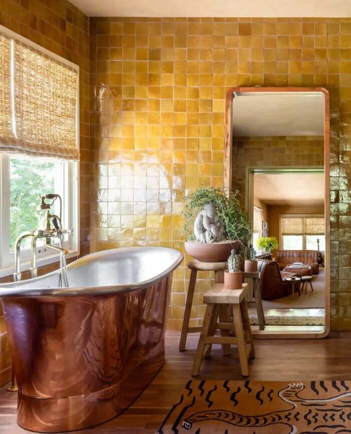 The glossy amber tiles behind that hammered copper tub are dramatic, but the wood floor holds it steady. For bathroom tile floor and shower matching, pull the metal finish into your hardware and mirror frame. I’d use a warm brass drain cover too. That tiny repeat of color is how coordinating floor with shower tile gets easy and smart.