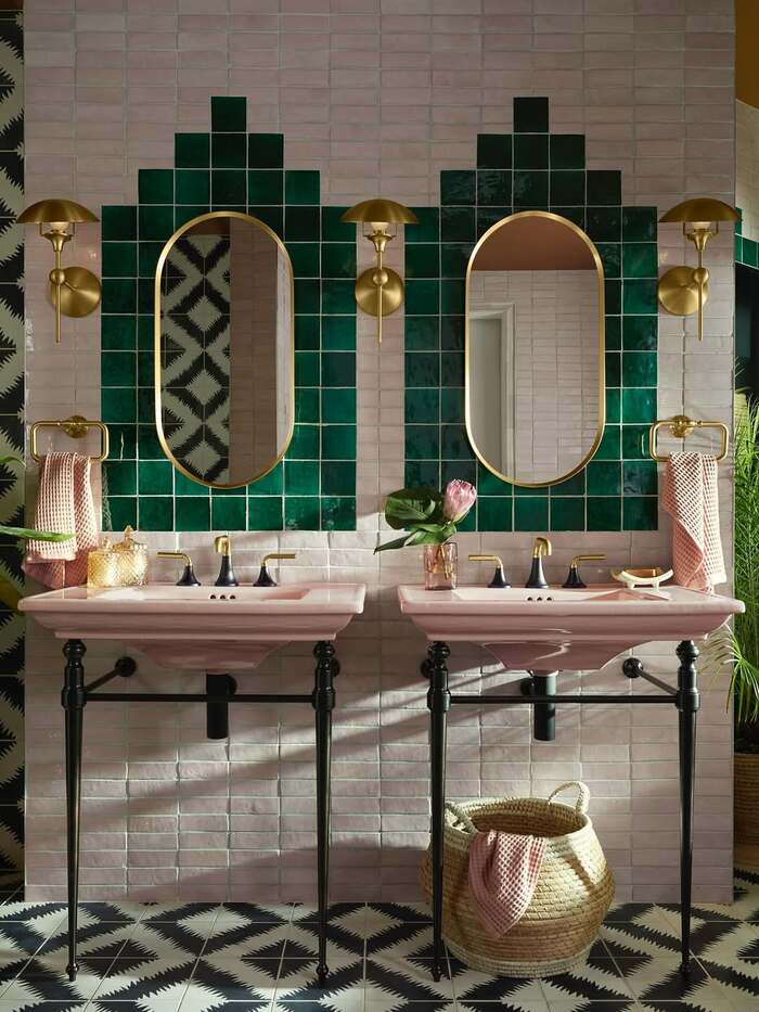 See those deep green squares forming arch shapes around the mirrors? Paired with pale pink field tiles, this is matching floor and shower tile without shouting. The patterned black and white floor brings rhythm while the shower area borrows the same green weight. Try this when you want floor and wall tile matching in baths without losing charm.