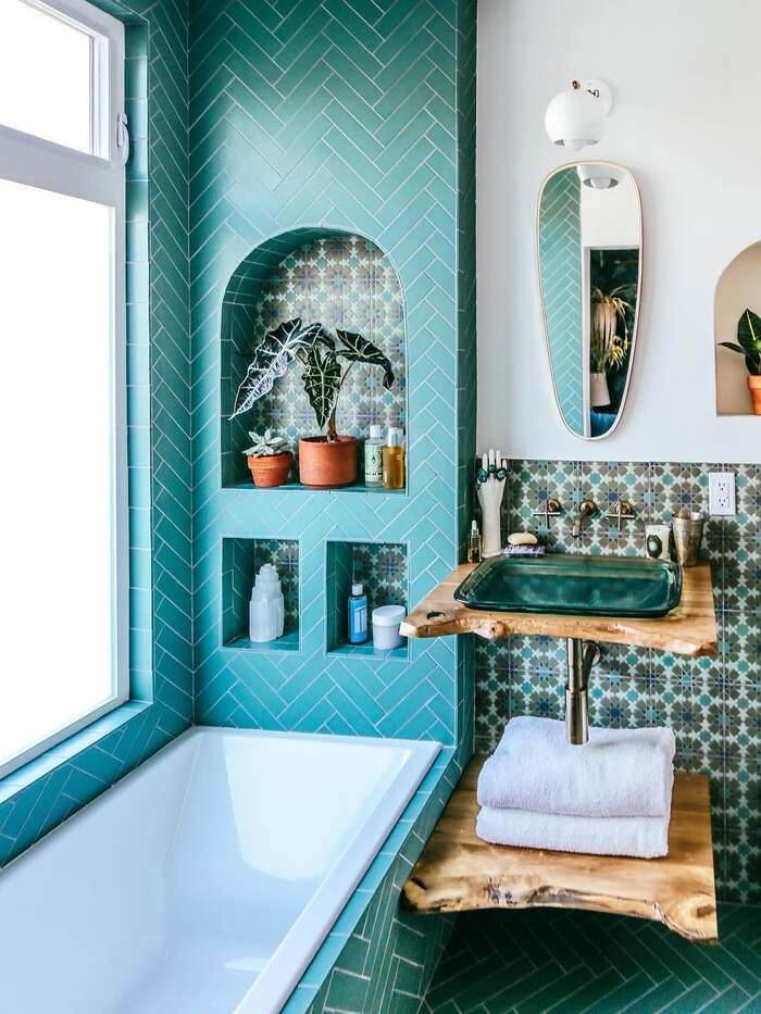 The teal chevron tile wraps the tub and dives into wall niches. I love this trick for floor and shower tile combo planning. Repeat the layout style. Chevron on the walls, straight lay on the floor, or the other way around. Same color family, different direction. It’s a little cheat that makes cohesive floor to shower tiles happen fast.