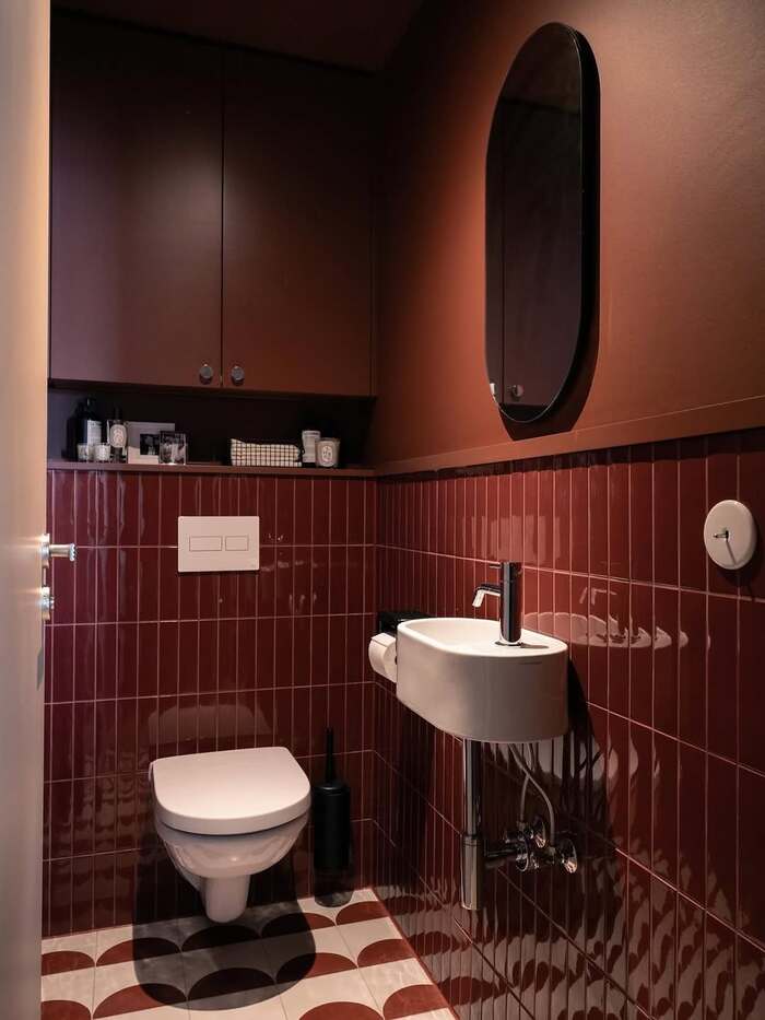 That burgundy half bath is dramatic in the best way. The tall skinny tiles create height, and the patterned floor circles back to similar tones. When I coach clients on tile pairing for floor and shower, I always say pick one star and one helper. The helper sets the beat. The star dances.