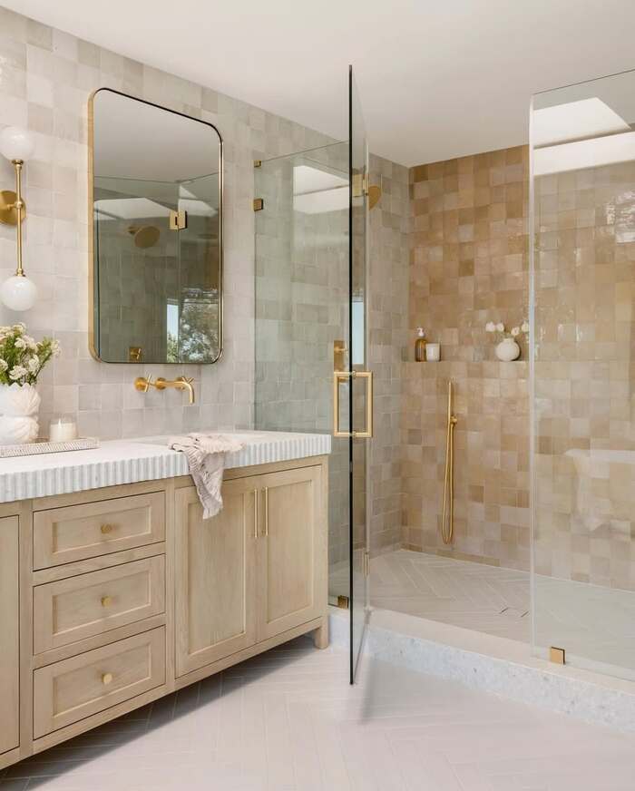 Neutral lovers, this is your moment. Beige and cream tiles with soft variation are so forgiving. The shower continues the same family of hues, and the floor goes quieter still. This is 10+ bathroom floor and shower tile matching that feels spa-like. Add brushed gold for warmth and it won’t go flat.
