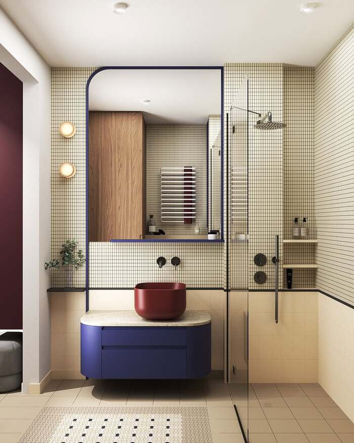 Modern fans, the tiny grid tile is super neat. The navy vanity and red vessel sink add punch, but the floor’s simple squares keep it from getting bossy. If you want harmonized floor and shower tile set, repeat the grid scale once, then relax the second surface with larger squares. Your eye gets a rest stop.