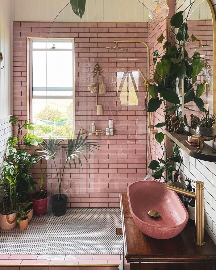 The rosy subway tile plus brass fixtures is sweet without being syrupy. I love the penny mosaic pan for grip and sparkle. If you want a bathroom shower tile idea that feels happy every day, copy this. Plant lovers, tuck a palm in the corner and it turns into a tiny spa. Great for small shower tile ideas because the skinny grout lines keep the space airy.