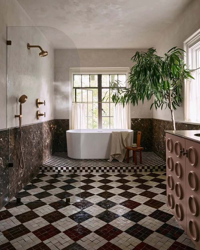 Chocolate, cream, and wine-red squares laid on the diagonal. The floor runs fresh right into the shower zone, framed by a tidy threshold. If you’re hunting colorful shower tile ideas, this one’s brave yet classic. Pair with warm plaster walls so the pattern gets to shine.