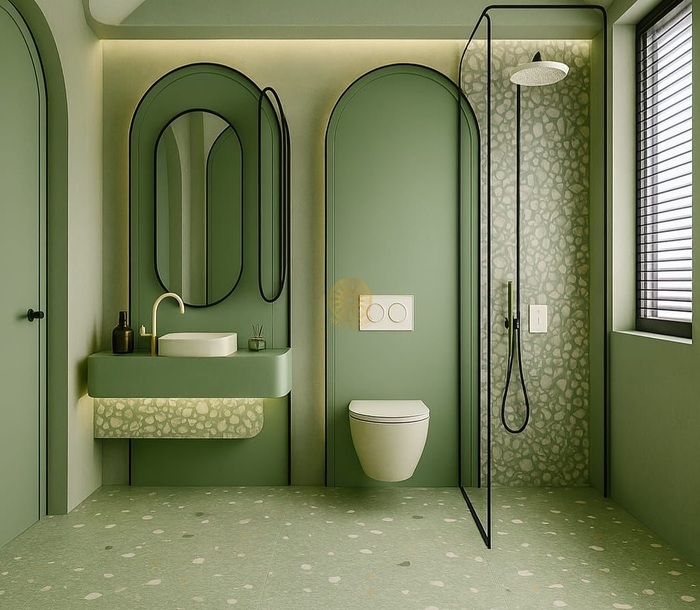 Soft green walls with terrazzo-speckled floors and those tall arches. Calm, modern, and a bit playful. For tile ideas for shower, pick a terrazzo mosaic for the pan and a matte arch frame so the curve reads clean. This is one of the 10+ bathroom shower tile ideas that looks spendy even when you choose porcelain.