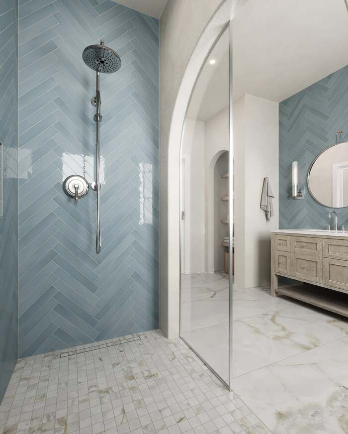 Blue herringbone field tile plus a light marble mosaic on the floor. Two textures, zero drama. I’d run a linear drain along the edge so cuts stay neat. Save this under modern shower tile ideas and also bathroom tile ideas for shower that need a gentle color pop.