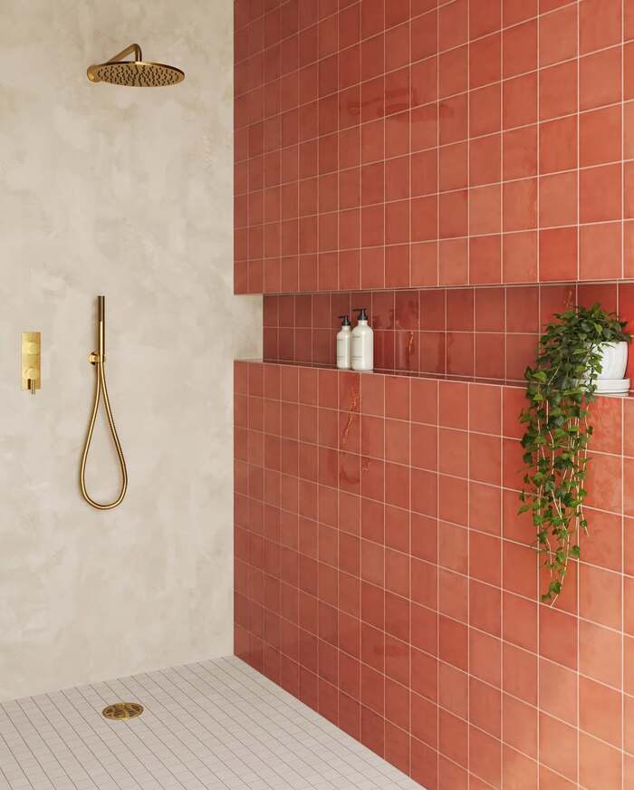 The tomato red wall tile looks like sun-warmed clay next to calm plaster. A tight white mosaic floor keeps it crisp. For ideas for shower tile, use brass trim around the niche and matching brass drain. This one sits high on my 10+ bathroom shower tile ideas list because it’s bold yet friendly.