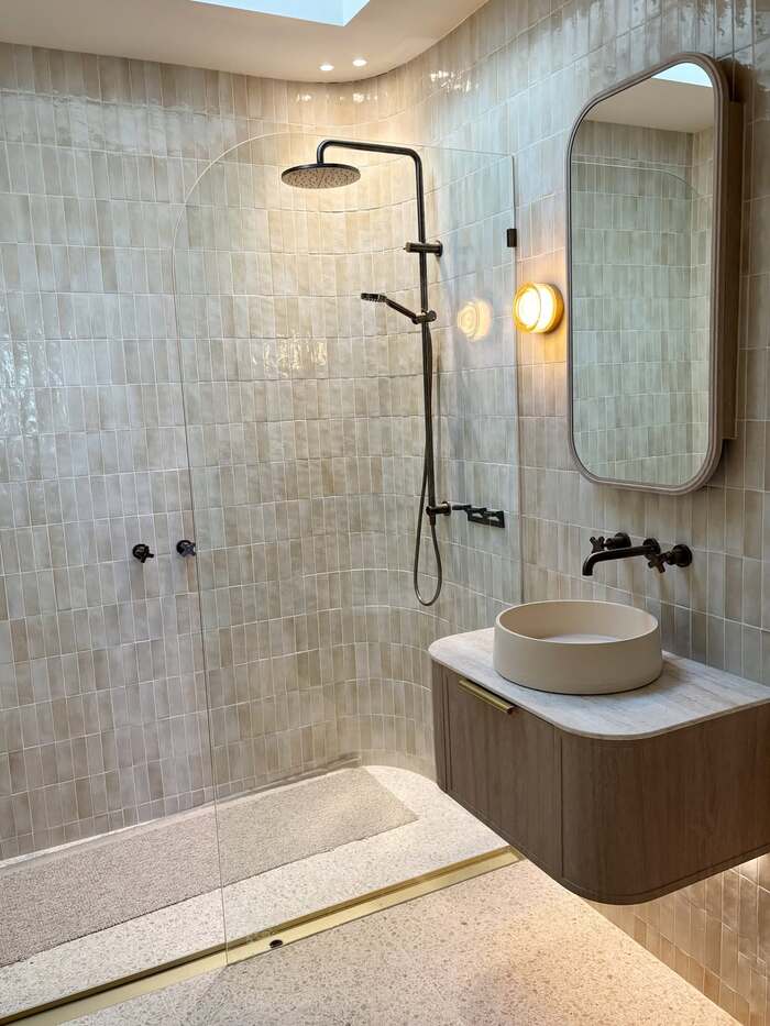 Glossy cream zellige wraps the walls while soft terrazzo flows across the floor. If you want non slip shower tile ideas, choose honed terrazzo with a small chip mix. Add a ribbed vanity and warm sconces for a cozy hotel vibe. Another win for my 10+ bathroom shower tile ideas board.