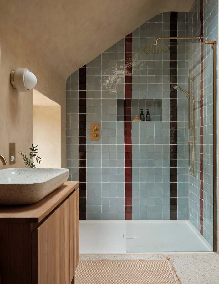 Vertical bands in burgundy and deep brown break up the sky blue squares. It’s graphic but not loud. A simple white shower base keeps it from feeling busy. Bookmark this under creative shower tile ideas and patterned shower tile ideas. Kids will love it. Grown ups too, honestly.