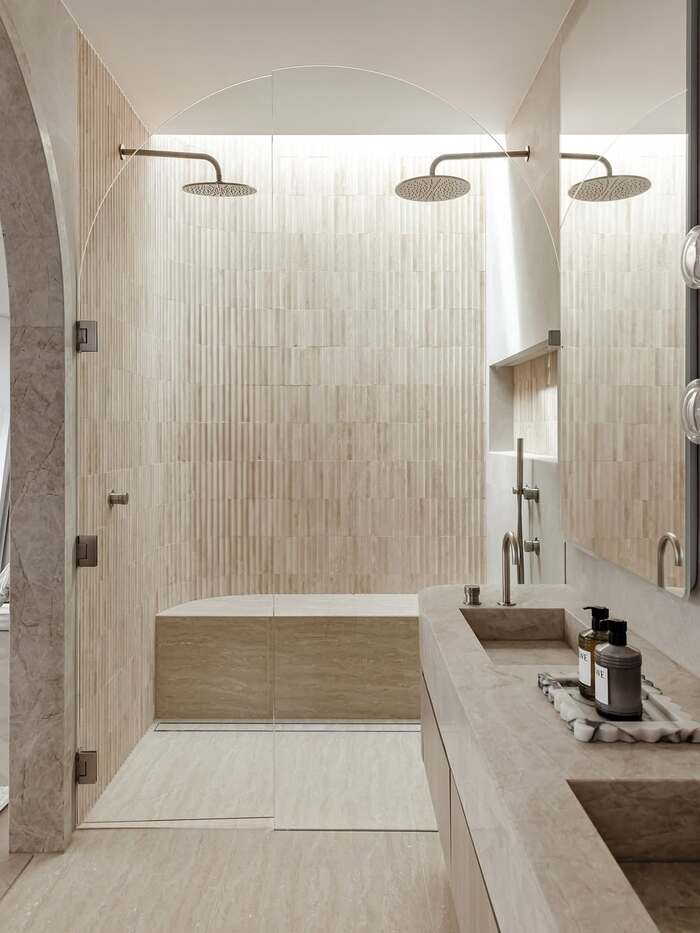 Neutral stone, ribbed details, and a built-in bench that says stay longer. Run your floor slabs into the pan, then switch to small stone mosaics right at the drains. That trick keeps slope smooth. File under classic shower tile ideas and also under calming bathroom shower tile ideas for forever homes.