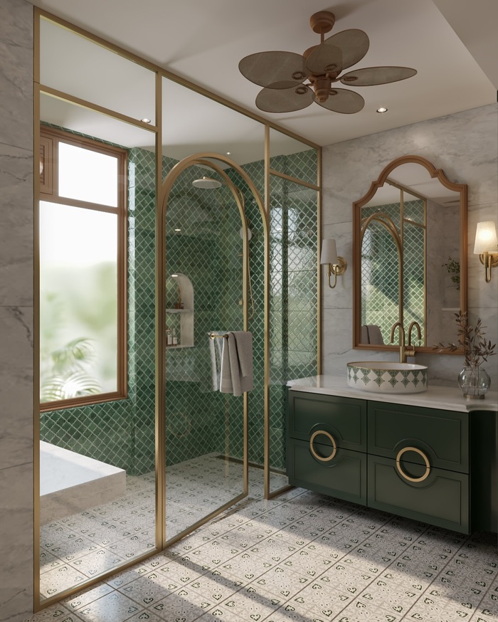 The green fish-scale shower with gold framing feels like a jewel box. I love how the patterned floor picks up just a whisper of that green. Personal confession, I once tried mixing two brasses and it looked confused. Stick to one warm metal here. File this in my [10+ bathroom tile floor ideas master baths] folder because it balances glam with calm. Variation to try for your bathroom floor tile ideas add a thin brass schluter to echo the door arch.