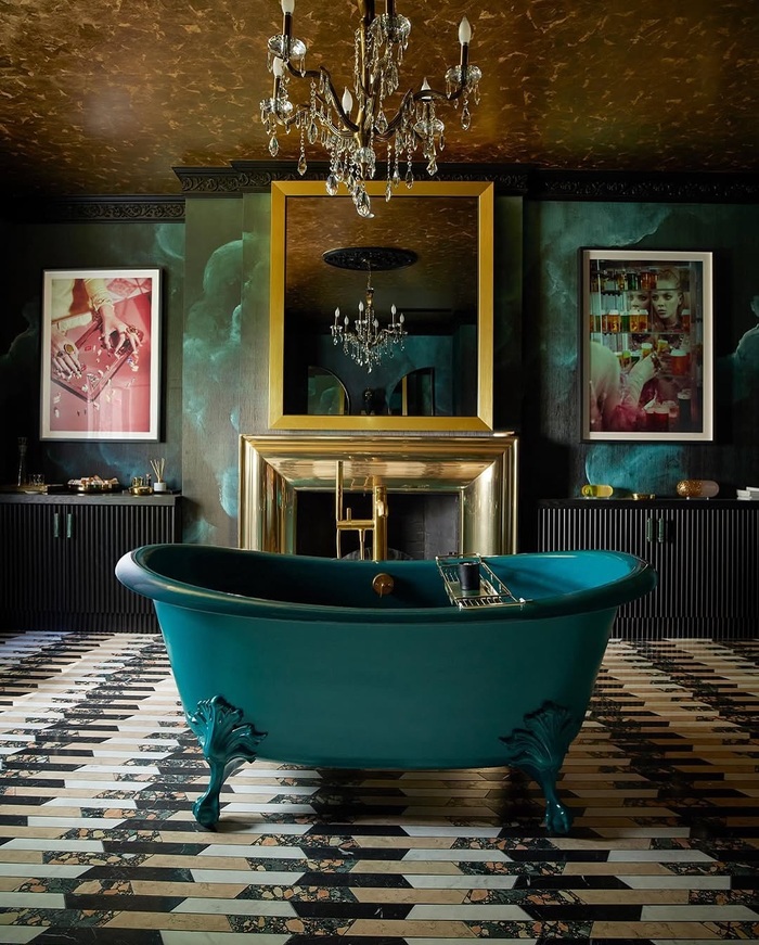 The teal clawfoot and stripey stone floor are a mood. It’s like a jazz track, a little unexpected, super cool. If you attempt master bathroom tile floor ideas like this, keep wall art minimal and let the tub color echo one stripe from the floor. That small echo makes the whole composition feel intentional. Another keeper for [10+ bathroom tile floor ideas master baths].