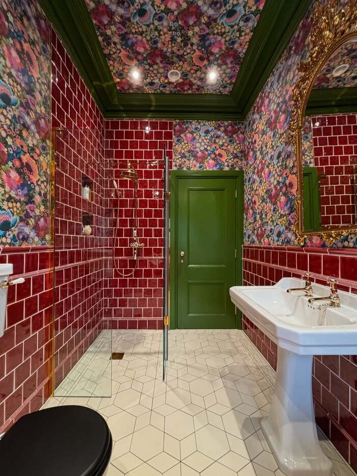 The glossy merlot subway and floral ceiling are fearless, then the white geometric floor brings air back into the room. That hex weaves without being busy. When you chase bold color, keep the tile floor ideas for master baths on the ground lighter so feet feel grounded. A soft beige grout will hide dust better than bright white.