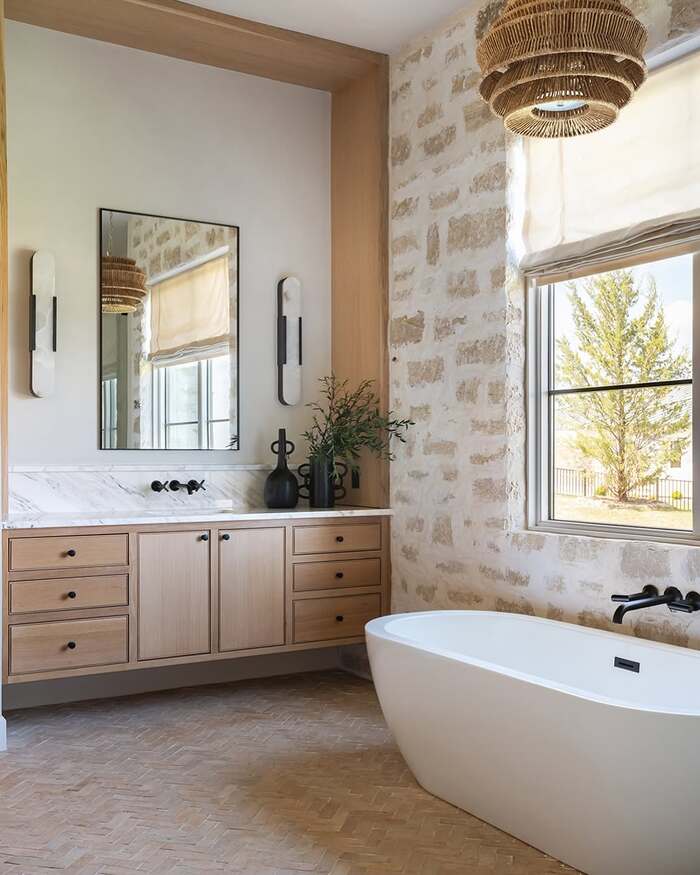 That pale herringbone brick floor is soft underfoot and hides dust like a champ. The limewash wall and rattan light keep it earthy. If you want** ideas for master bathroom tile floors** that age gracefully, go for something matte, slightly textured, and let your metals stay dark. Add a plant. It wakes up the neutrals instantly.