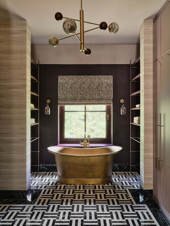 This floor is a museum moment. Basketweave stripes in black and white, framed with a dark border, then a glowing metal tub. Tip from a job site fail I had, lay out the entire pattern with painters tape first. Doorways and vents love to ruin perfect repeats. Patterns like this belong in any list of [10+ bathroom tile floor ideas master baths] for people who want art underfoot.