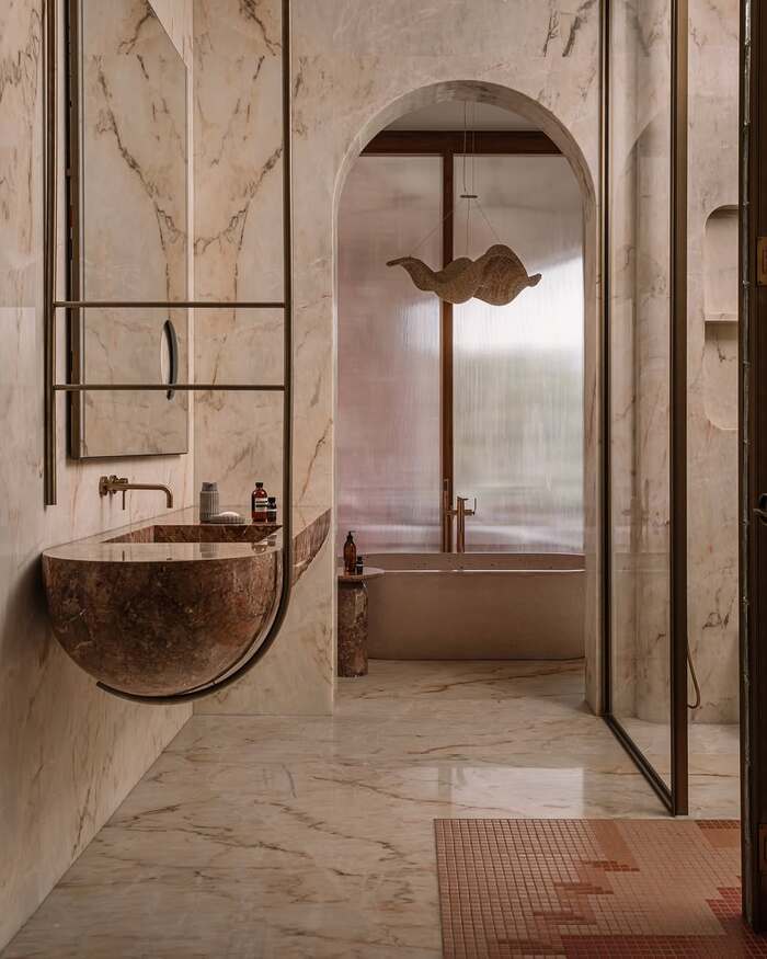 Creamy stone everywhere, but the tiny mosaic “rug” near the arch saves it from bland. I like a micro mosaic insert because it defines a vanity zone without a real rug. For bathroom tile flooring ideas, pick a mosaic color that’s one step warmer than your slab so the rug reads intentional not random.