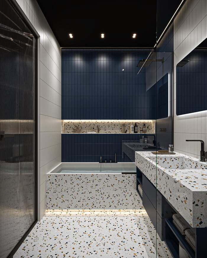 Deep blue plank tiles on the wall, terrazzo on the deck and floor, and that slick integrated shelf. LED toe-kicks make everything float. If you copy these bathroom tile floor ideas master vibes, keep the chip size small. Big chips get chaotic in tight spaces. Matte black fixtures help the speckle shine without shouting.