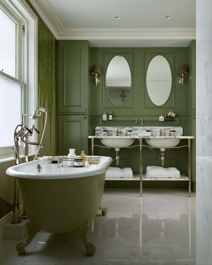 Soft green built-ins feel traditional and cozy. The large-format marble floor is reflective but not slippery if you choose a honed finish. This shows how bathroom tile floor ideas can be simple and still fancy. Repeat the marble on a narrow shelf to pull the eye across the room.