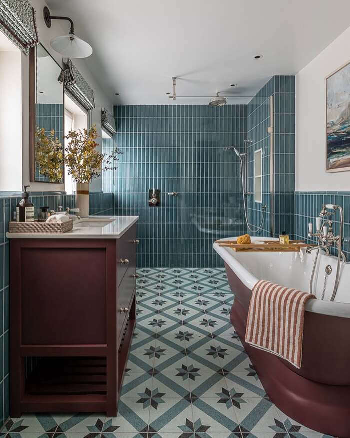 The tall teal wall tile stretches the room, while the geometric star floor brings fun without chaos. I pair it with warm gray grout so the pattern blends. Secret hack from site work: repeat one teal tone in a towel or tub base to lock the palette. This is one of my bathroom tile ideas for bold houses that still want calm mornings. Another reason it lands in my 10+ bathroom tile ideas list is the way it photographs like a dream.