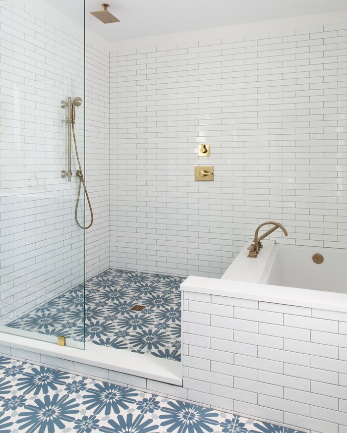 Grout is a color. Warm grout softens cool blues and greens. Dark grout outlines shapes for graphic tiles for bathroom lovers.
