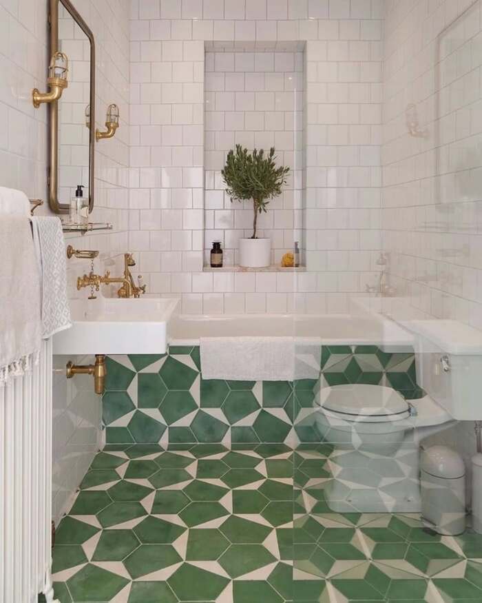 The floor climbs the tub apron, which is such a neat move. It makes a tiny space feel designed on purpose. Use a narrow trim at the step so edges look intentional. I learned the hard way that skipping trim makes chips happen. Add a potted olive or fern and you’ve got earthy bathroom tiles with personality. Another keeper in my 10+ bathroom tile ideas notebook.