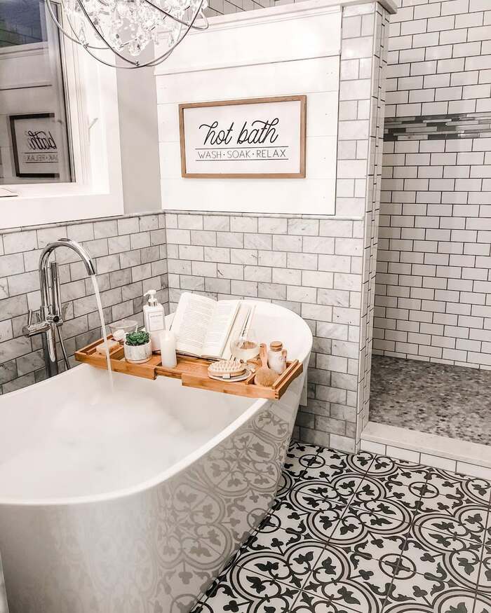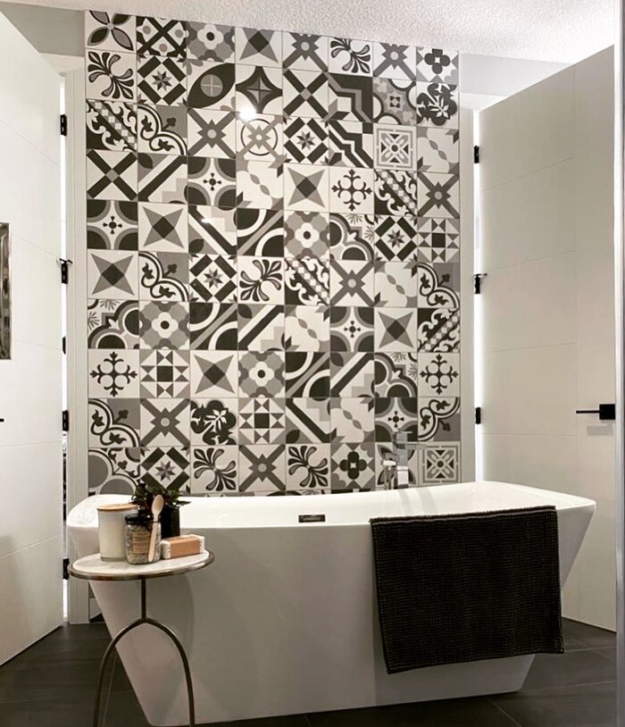 Mix-and-match squares behind the tub turn a plain bath into a gallery. Keep the other surfaces simple so your brain doesn’t get dizzy. If you worry it’s too busy, run a solid charcoal floor. This is a brave pick for bathroom tile patterns, and I’m cheering for you.