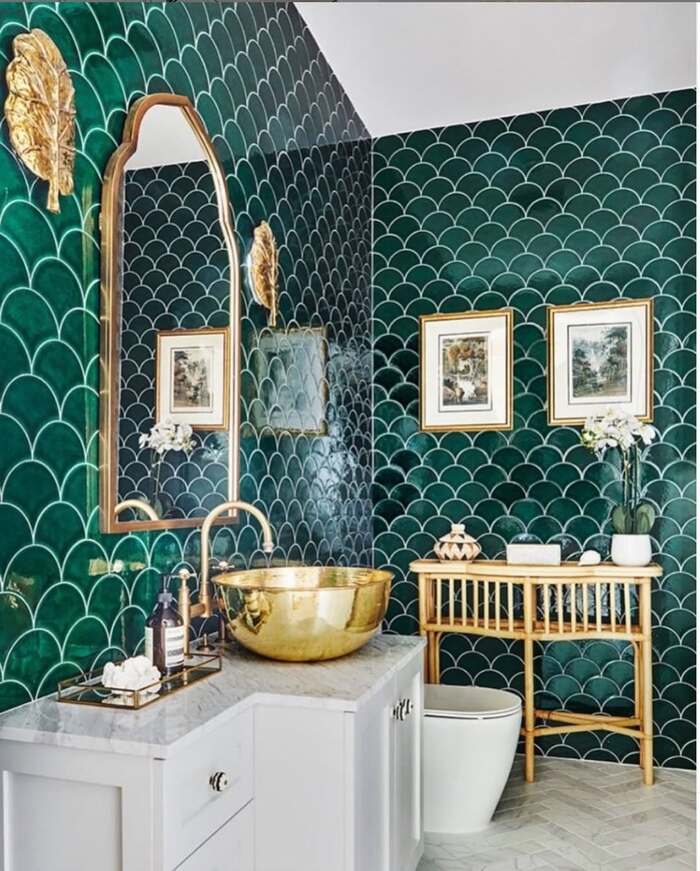 These scallops glow. The glaze ripples, the brass bowl sink sparkles, and the white vanity keeps things grounded. Try a pale sage herringbone on the floor so the walls stay the star. If you love statement bathroom tile design, this is your moment. Another reason it’s in my 10+ bathroom tile ideas lineup is durability. Glazed ceramics clean easy if you squeegee. I do, even if I grumble.