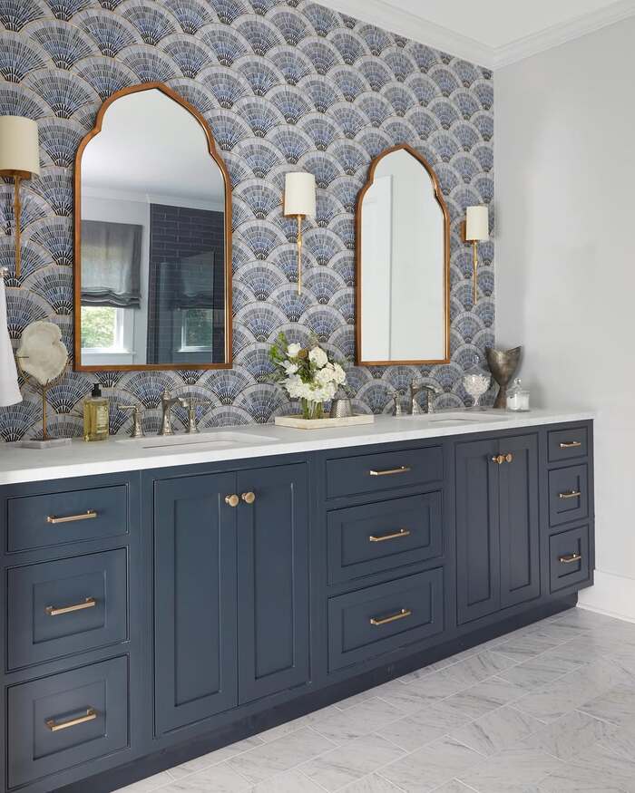 That fan motif wall tiles out like art and pairs with navy cabinetry. Let the floor stay quiet in pale marble porcelain so the pattern breathes. Repeat brass on the mirrors and faucets to tie the room together. I reach for this look in modern bathroom tile ideas when clients want hotel energy at home.