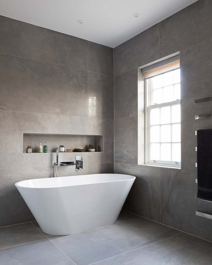 Big slabs of gray tile on walls and floors create calm, like a warm cloud. Tight grout joints mean faster mopping and fewer lines. Add a built-in niche so bottles stop multiplying on the ledge. Great for minimal bathroom tiles lovers who still want texture. It also sneaks into my 10+ bathroom tile ideas because it ages well.