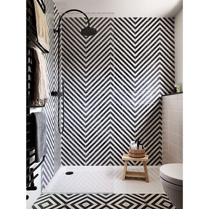 6. Plan the drains. Linear drains keep lines clean on striped or chevron black-and-white tile floor layouts.