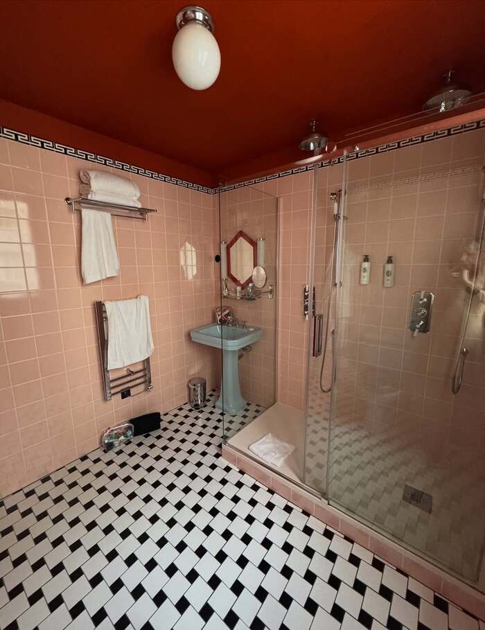 Peachy square wall tiles, red ceiling, and a small-scale diamond black and white tiled floor. It feels like a vintage motel in the best possible way. My confession, I tried this check once with bright white grout and it looked harsh. Go light gray. This quirky room still counts as a 10+ bathroom with black and white tile floor keeper.