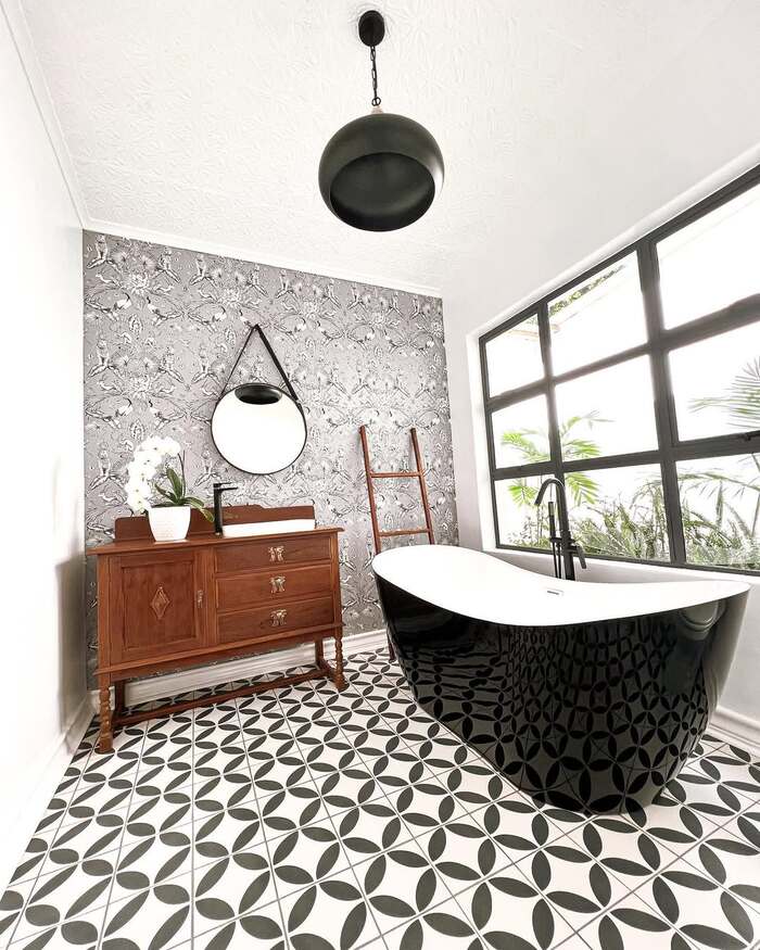 The flowerlike circle motif feels retro without being kitsch. Pairing the soft wallpaper with a graphic black & white bathroom floor is chef’s kiss. Wood vanity warms everything. Another 10+ bathroom with black and white tile floor favorite when you want playful but still grown-up. Variation to try: run the same motif on the tub skirt for a secret wink.