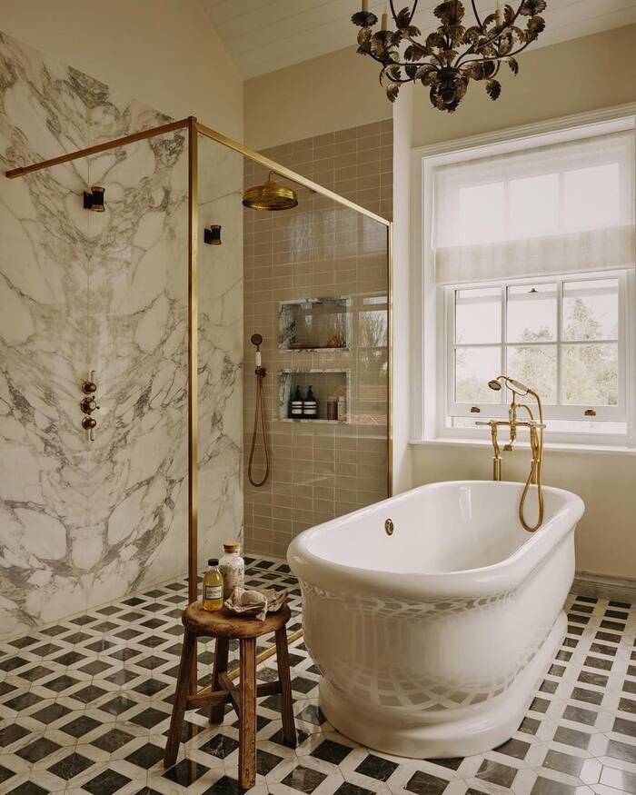 Another labyrinth but chunkier, framed with glossy black marble borders. The aged brass tub glows against the black-and-white flooring like a candle. Keep towels off-white, not stark, so everything feels cozy. This 10+ bathroom with black and white tile floor pick proves contrast can still feel soft.