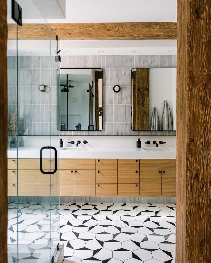 The floor uses chunky polygons that click together like a puzzle. It’s modern without shouting. Oak cabinetry and soft gray wall tile calm the room, while the monochrome tile floor carries the graphic punch. I suggest a narrow black threshold at the door so your eye knows where to stop. A stylish 10+ bathroom with black and white tile floor option for design lovers who hate fuss.