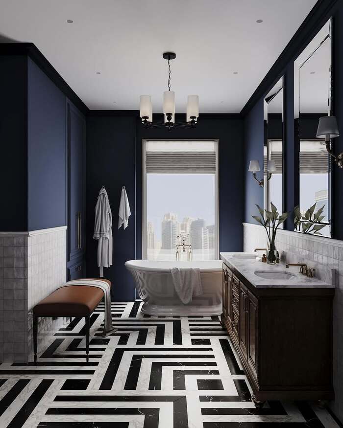 This high-contrast maze pattern is drama in the best way. Dark walls, white marble vanity, then a labyrinth black-and-white marble floor underfoot. Use a low-sheen sealer so reflections don’t fight the lines. If you want a dramatic 10+ bathroom with black and white tile floor, this is it. Add one warm element, like a cognac bench, or it gets chilly.