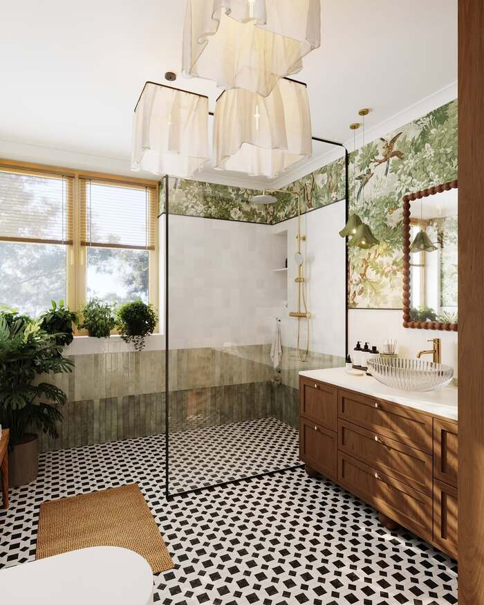 The floor reads like little 3D cubes. Pairing it with sage tile below a leafy mural is super fresh. Brass shower and wood vanity add nature vibes. If your window light is strong, this graphic black and white tile flooring will sparkle all day. Place a jute mat by the door for texture and slip control.