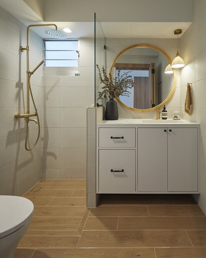 That first space wins for comfort. Pale oak-look planks run straight into the shower without tripping your eye. If you try a wood-look tile bathroom floor, keep grout 1 to 2 shades darker than the tile. Hides dust. The brass fixtures add warmth, so the wood tile bathroom flooring doesn’t have to shout. My opinion, and I’ll stand by it.