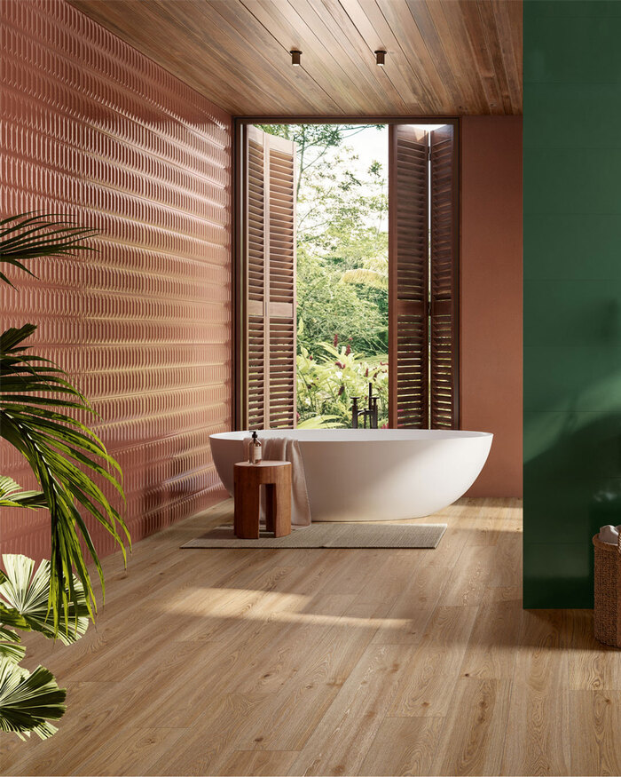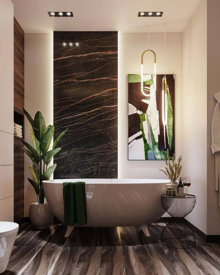 Bold stone behind the tub and a deep walnut wood-look porcelain tile floor make drama feel grown, not loud. A plant gives breath. Trick I use a lot. When the walls are busy, choose a calmer wood effect tile floor in the bathroom with long planks and low contrast. The grain still sings, just not karaoke-level.