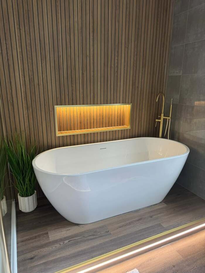 Backlit wood slats on the wall pair with a soft gray-brown wood-look plank tile floor. It’s spa without fuss. If you want that floating feel, add a tiny LED strip at the tub base. Reflects off the wood look ceramic tile floors and looks way more expensive than it costs. Seal the grout early. Steam loves fresh grout.