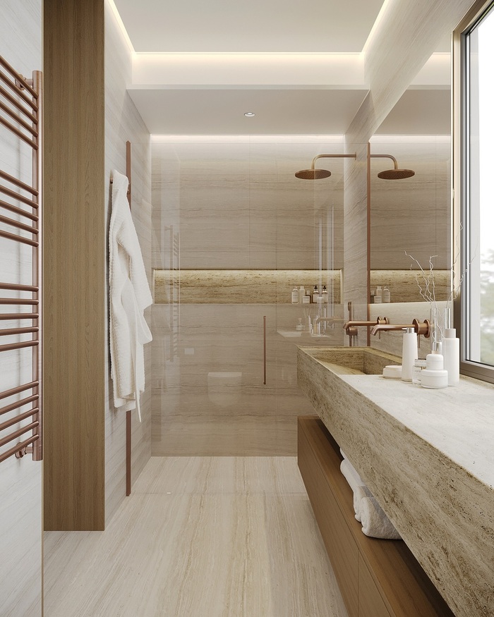 Everything here whispers. Beige walls, linear drain, and creamy timber-look tile flooring that runs unbroken. Long planks make narrow rooms read longer. Keep your thresholds flush so wheel-in showers feel effortless. Another hack from my crew. Pivot the plank direction toward the window to drag light across the room.
